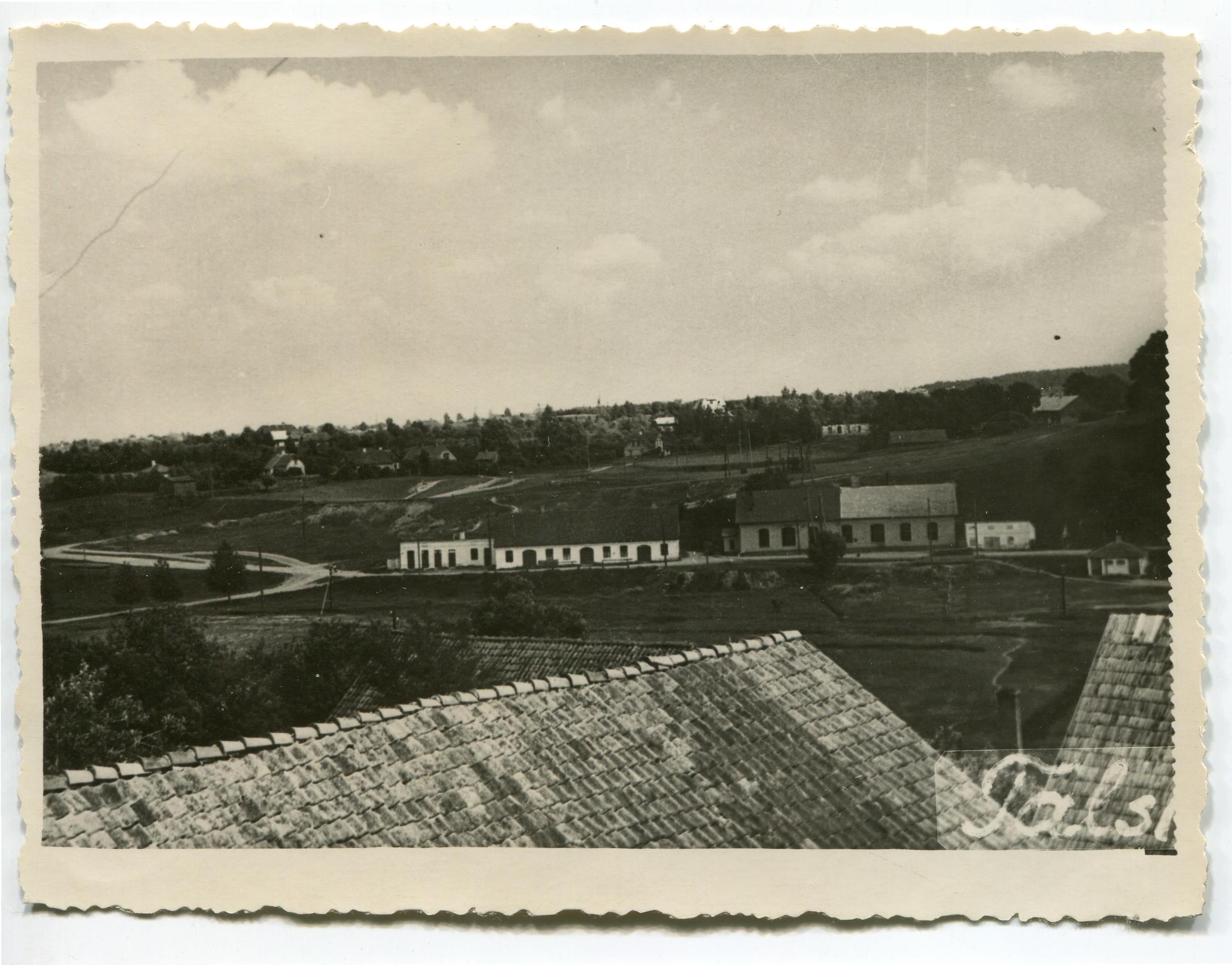 Skats uz Ezera ielu. No kreisās 2. ēka (ar melnu jumtu) - pilsētas lopkautuve; 3. ēka (ar divkrāsainu jumtu) - pilsētas spēkstacijas ēka; 5. ēka (ar tumšu jumtu) - sabiedriskā tualete jeb labierīcības. Priekšplānā dakstiņu jumta segums.