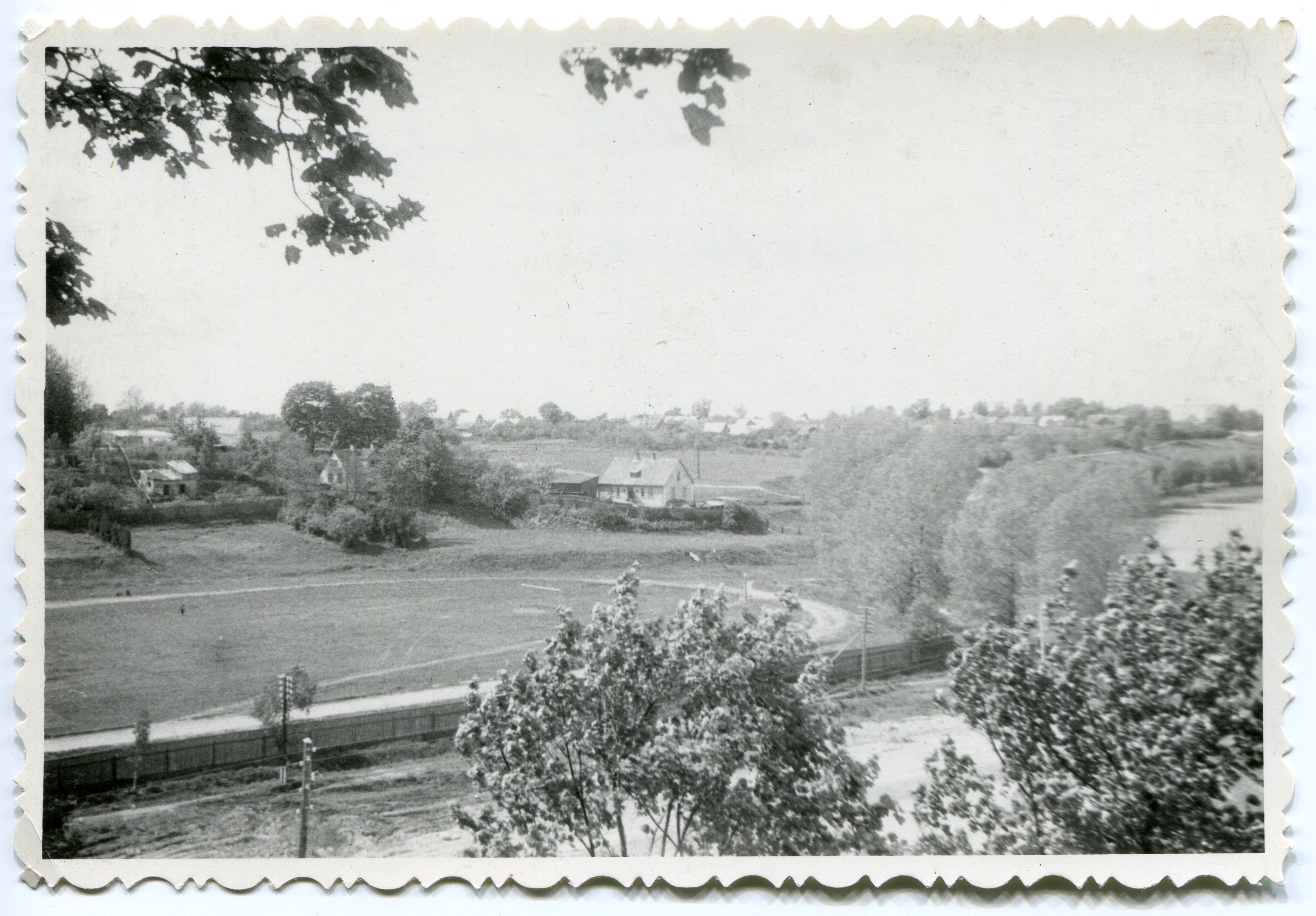 Talsu pilsētas sporta stadions pie Vilkmuižas ezera. Kreisajā malā slejas Krievraga kalns. Fotogrāfijas labajā malā redzams Vilkmuižas ezers. Centrā dzīvojamā ēka Kareivju ielā. Skats no Dzirnavkalna.