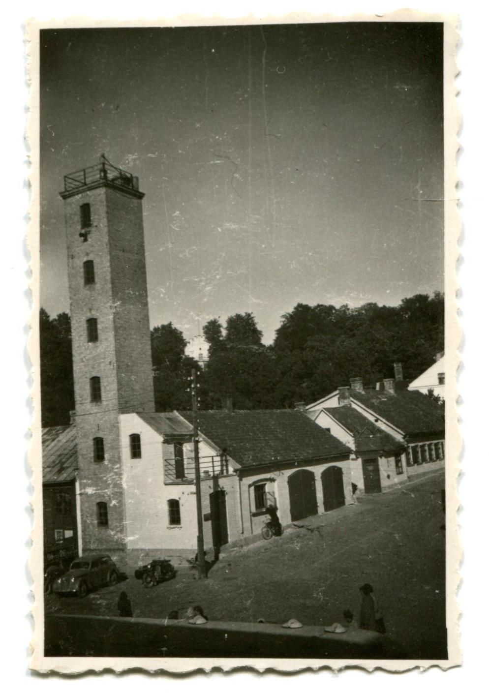 Ezeru laukuma un Kalna ielas krustojumā 1874. gadā celts Talsu miesta ugunsdzēsēju biedrības (1923. gadā pārdēvēta par Brīvprātīgo ugunsdzēsēju biedrību) depo jeb BUB depo (fotogrāfijā pa labi no torņa). 1884. gadā pie biedrības nama uzcelts koka tornis šļūteņu novietošanai. 1935. gadā koka torņa vietā uzcelts ķieģeļu korpusa tornis. Fotografēts no Ezeru laukuma ar skatu uz Kalna ielu. Pie BUB depo novietota automašīna un motocikls. Aiz depo redzama ēka ar piebūvēm Kalna ielā 2.
