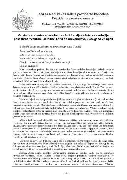 Valsts prezidentes apsveikuma vārdi Latvijas vēstures skolotāju pasākumā “Vēsture un laiks” Latvijas Universitātē, 2007.gada 26.aprīlī