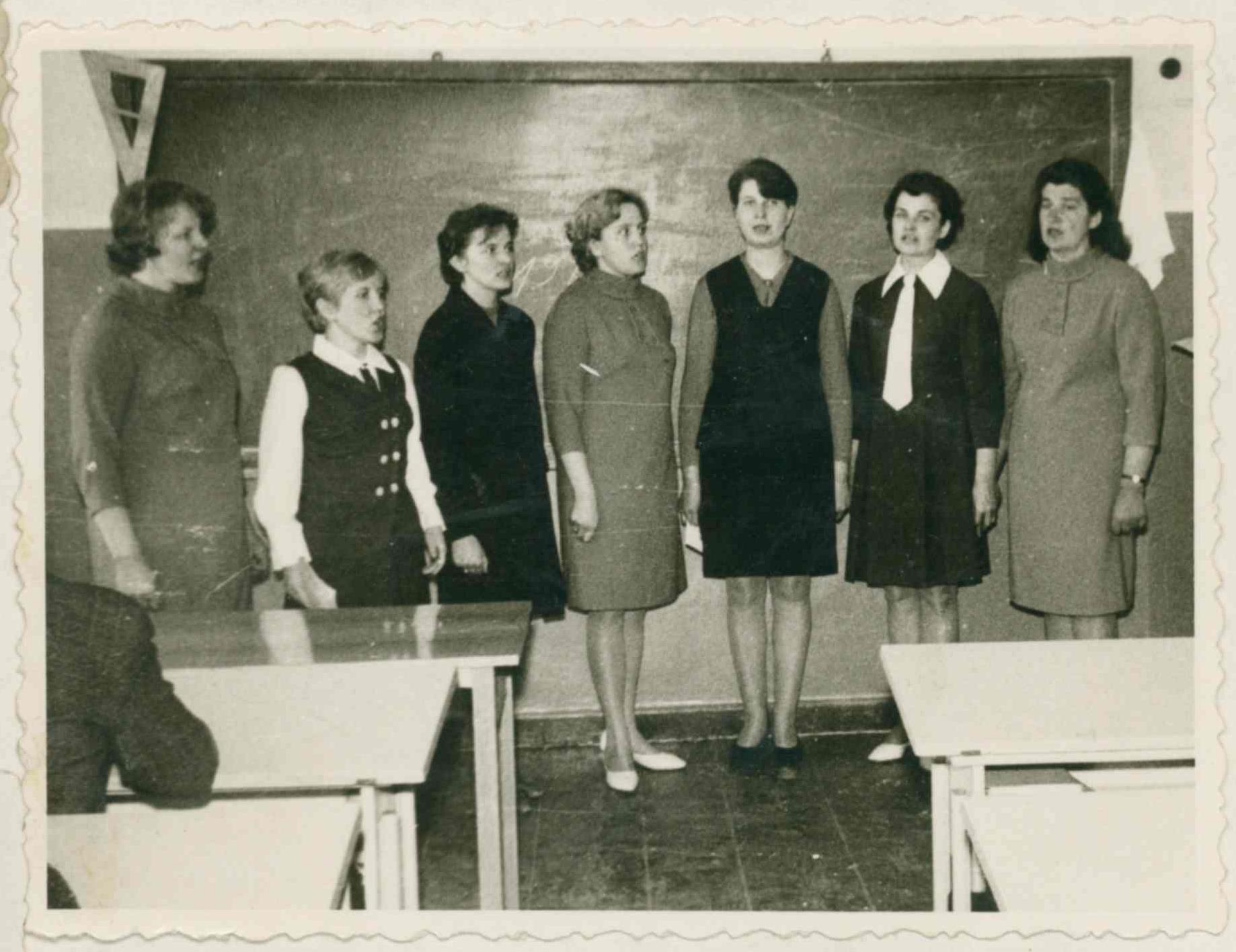 Ansambļa vadītājs Vilnis Beitiks. No labās puses: Olga Kalniņa, nezināma persona, Dzidra Matīsa (dzimusi Robeža), nezināma persona, Edīte Bindemane, Aina Volcīte, nezināma persona.