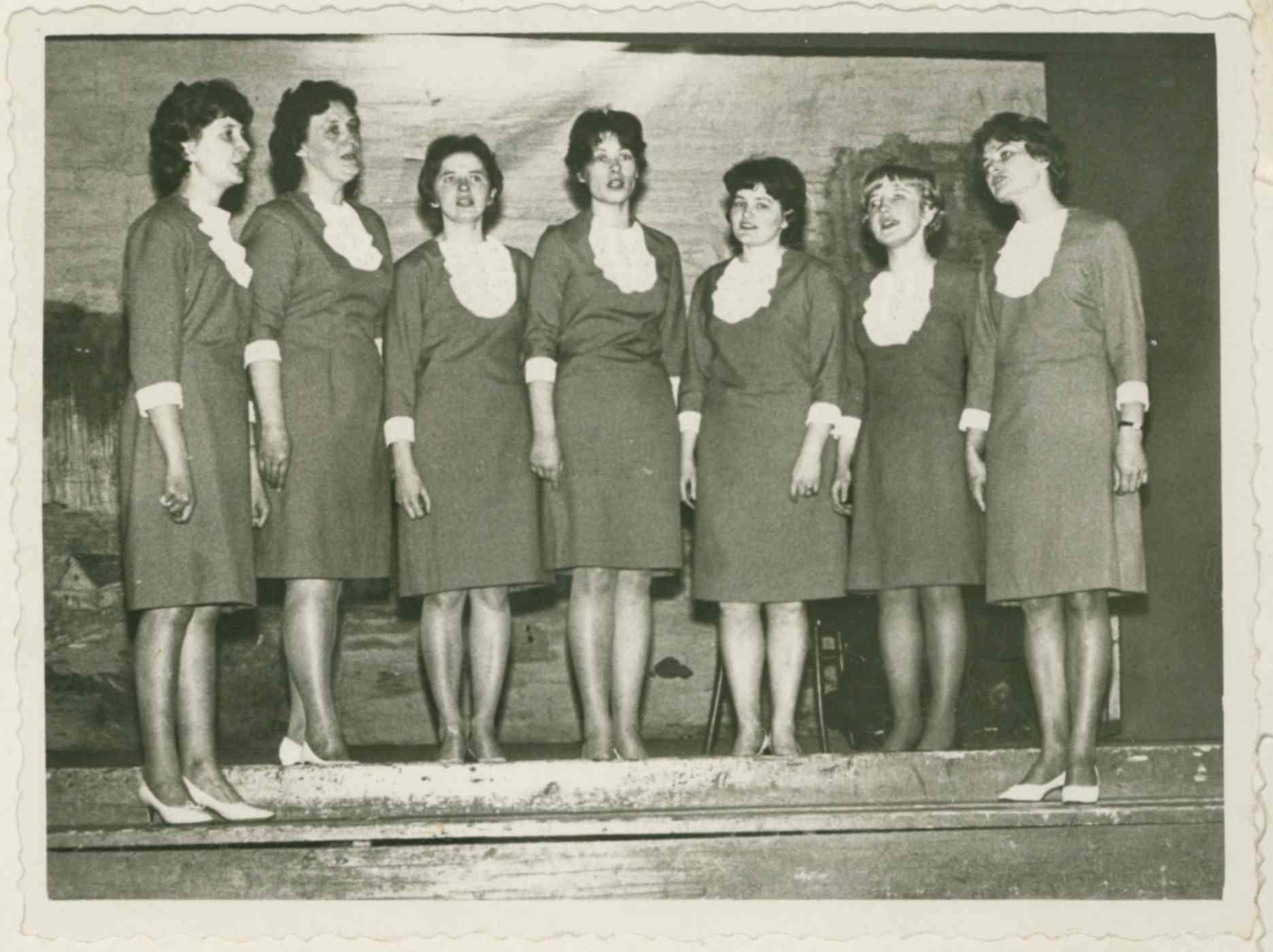 No kreisās puses: Dzidra Matīsa (dzimusi Robeža), Vija Čakāne, Gaida Kanaviņa, Aina Volcīte, nezināma persona, nezināma persona, nezināma persona.