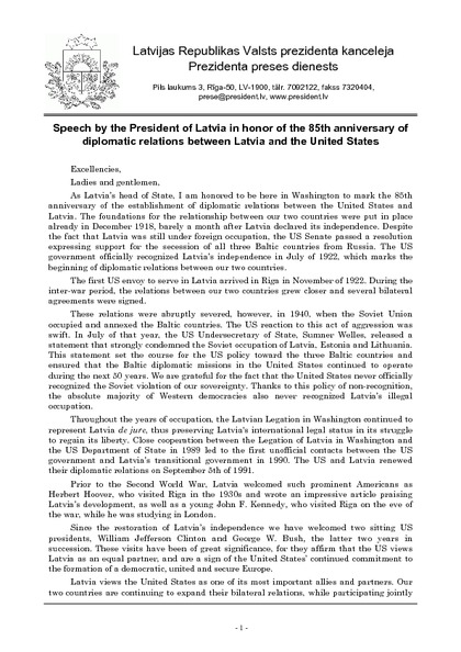 Speech by the President of Latvia in honor of the 85th anniversary of diplomatic relations between Latvia and the United States
