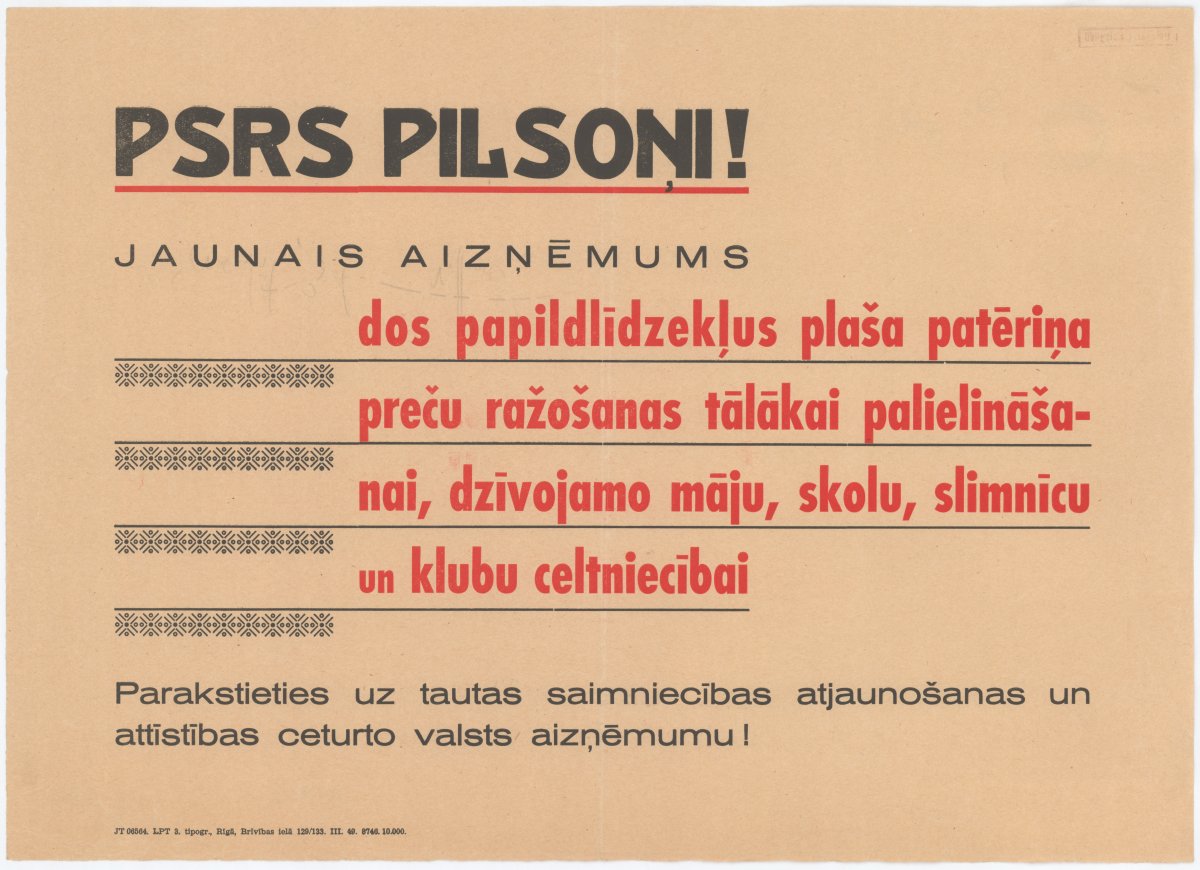 PSRS pilsoņi! [attēls] Jaunais aizņēmums dos papildlīdzekļus plaša patēriņa preču ražošanas tālākai palielināšanai, dzīvojamo māju, skolu, slimnīcu un klubu celtniecībai. Paraksties uz tautas saimniecības atjaunošanas un attīstības ceturto valsts aizņēmumu! / mākslinieks nezināms