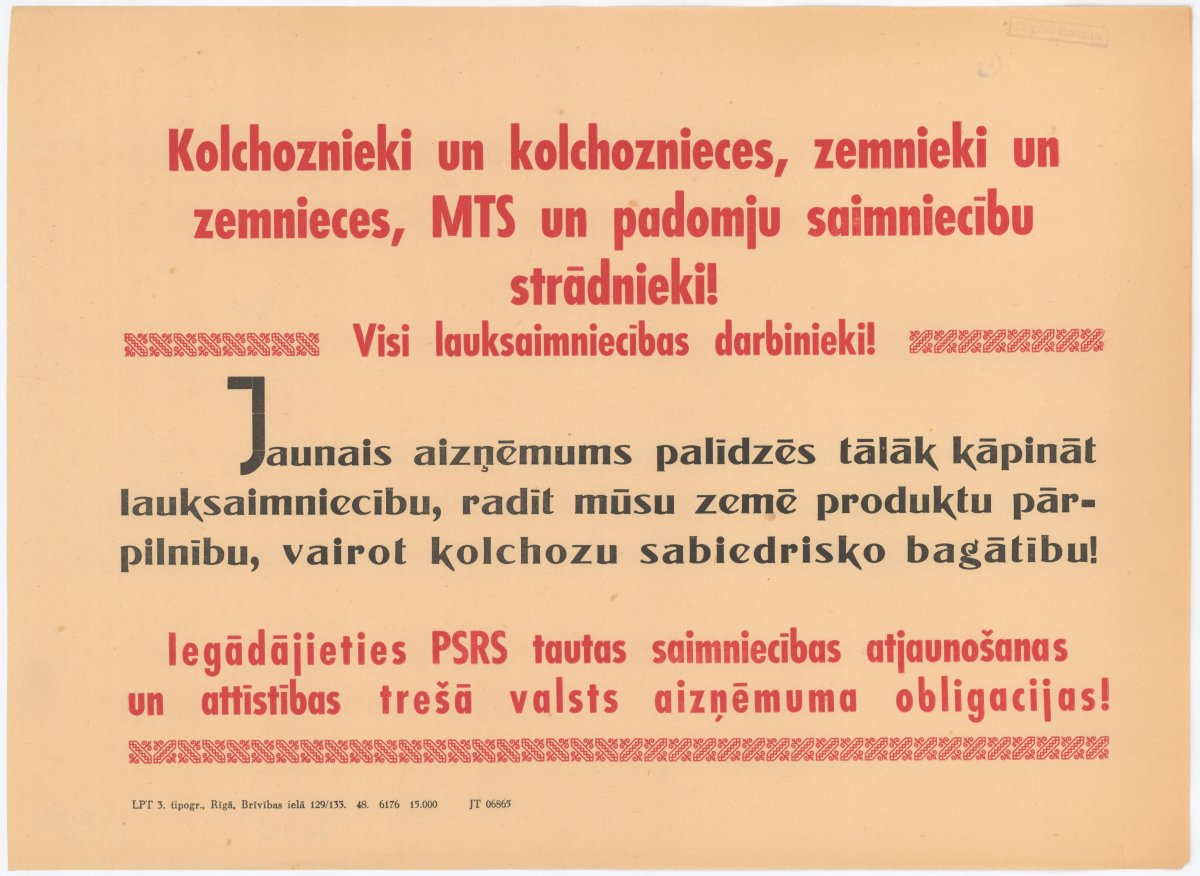 Kolchoznieki un kolchoznieces, zemnieki un zemnieces, MTS un padomju saimniecību strādnieki! Visi lauksaimniecības darbinieki! [attēls] Jaunais aizņēmums palīdzēs tālāk kāpināt lauksaimniecību, radīt mūsu zemē produktu pārpilnību, vairot kolchozu sabiedrisko bagātību! Iegādāsimies PSRS tautas saimniecības atjaunošanas un attīstības trešā valsts aizņēmuma obligācijas! / mākslinieks nezināms