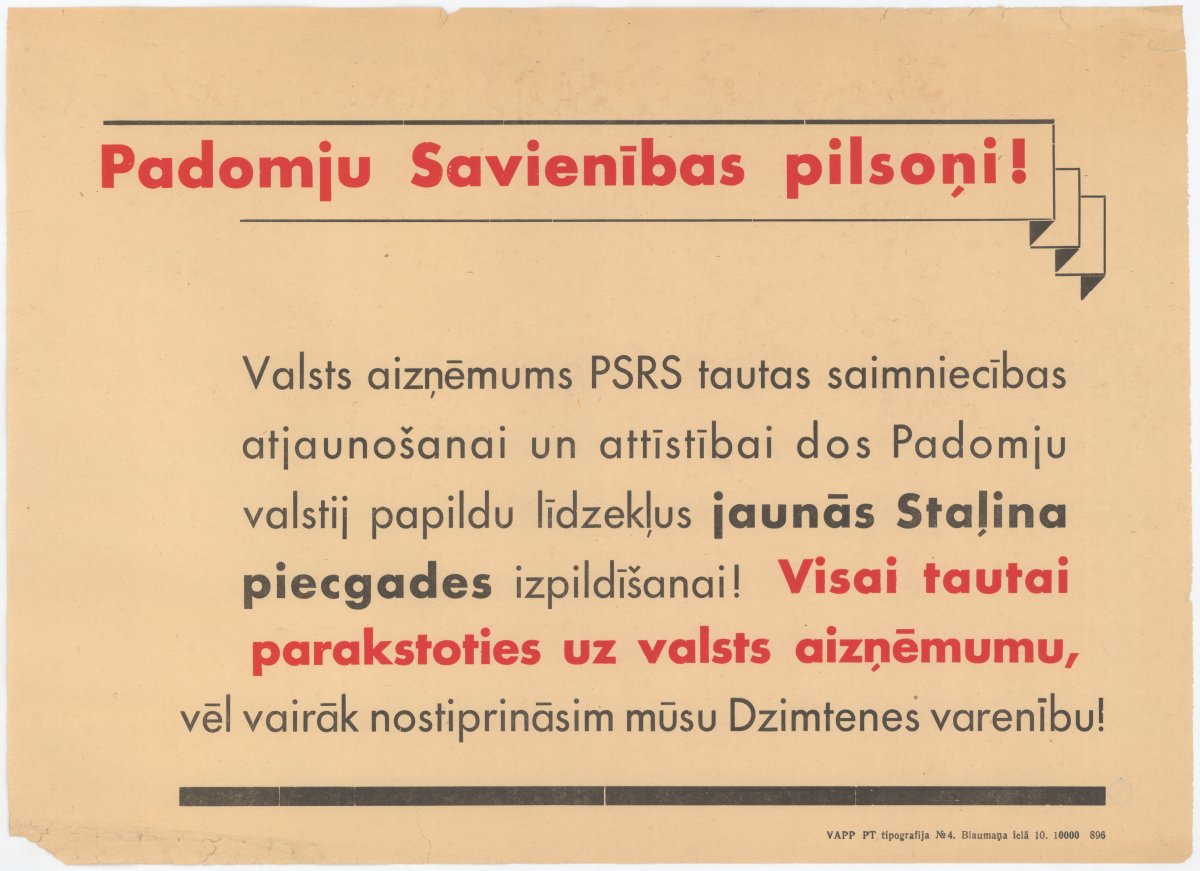 Padomju Savienības pilsoņi! [attēls] Valsts aizņēmums PSRS tautas saimniecības atjaunošanai un attīstībai dos Padomju valstij papildus līdzekļus jaunās Staļina piecgades izpildīšanai! Visai tautai parakstoties uz valsts aizņēmumu, vēl vairāk nostiprināsim mūsu Dzimtenes varenību! / mākslinieks nezināms