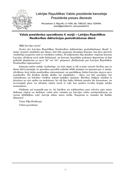 Valsts prezidentes apsveikums 4. maijā – Latvijas Republikas Neatkarības deklarācijas pasludināšanas dienā