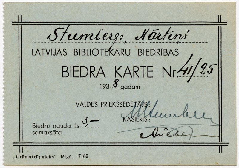 [Stumbergs, Mārtiņš] / Latvijas Bibliotekāru biedrības / biedra karte Nr. [41/25] / 1938. gadam ...