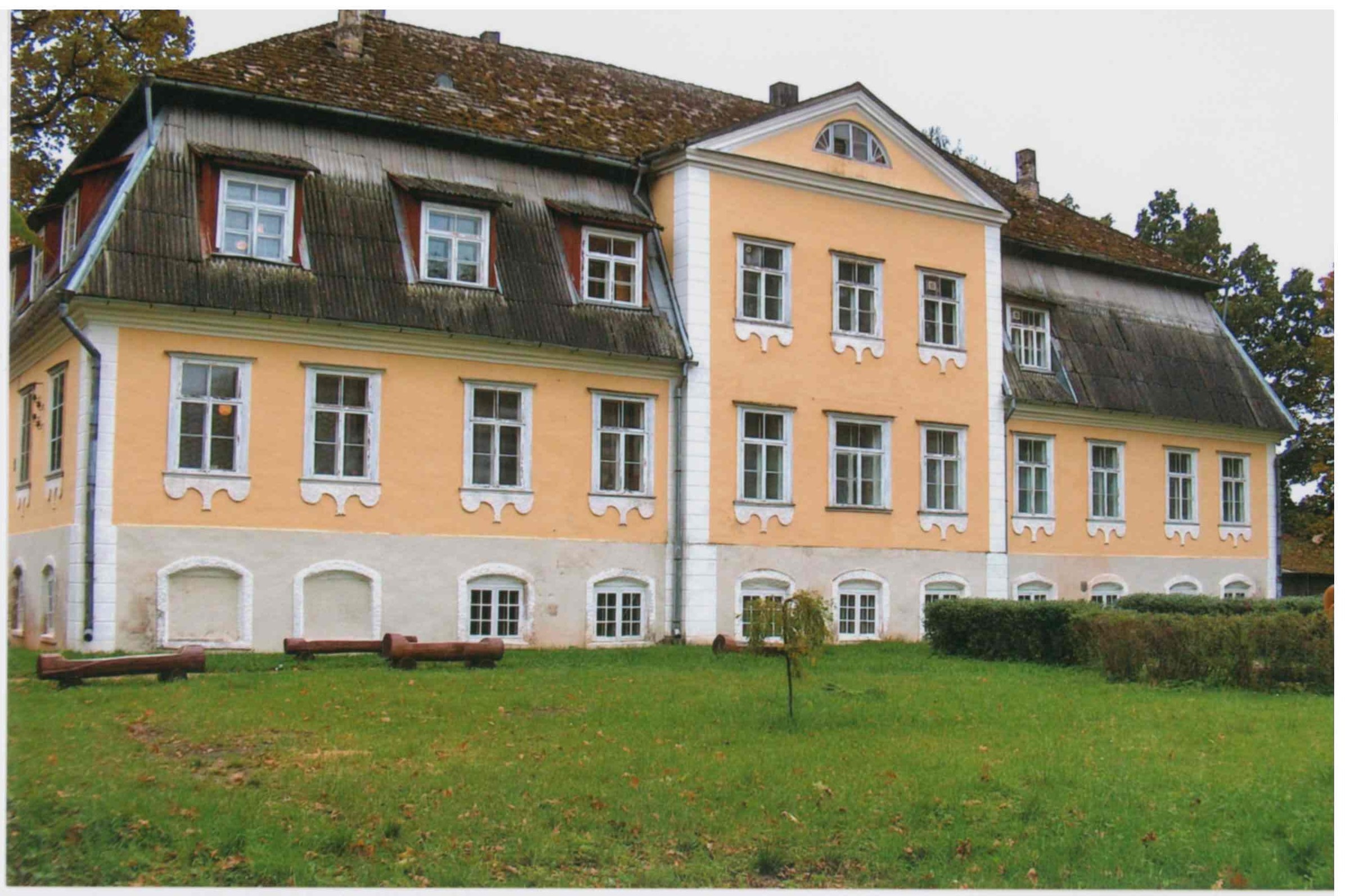 Beļavas muižas kungu māja pirms jumta seguma maiņas un bēniņu (ziemeļu pusē) pārbūves. Skats uz ēku no lauces puses.
