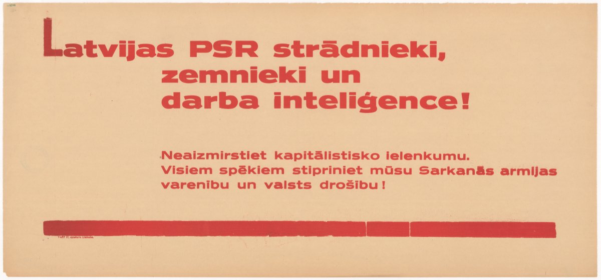 Latvijas PSR strādnieki, zemnieki un darba inteliģence! Neaizmirstiet kapitālistisko ielenkumu. Visiem spēkiem stipriniet mūsu Sarkanās armijas varenību un valsts aizsardzību! / mākslinieks nezināms