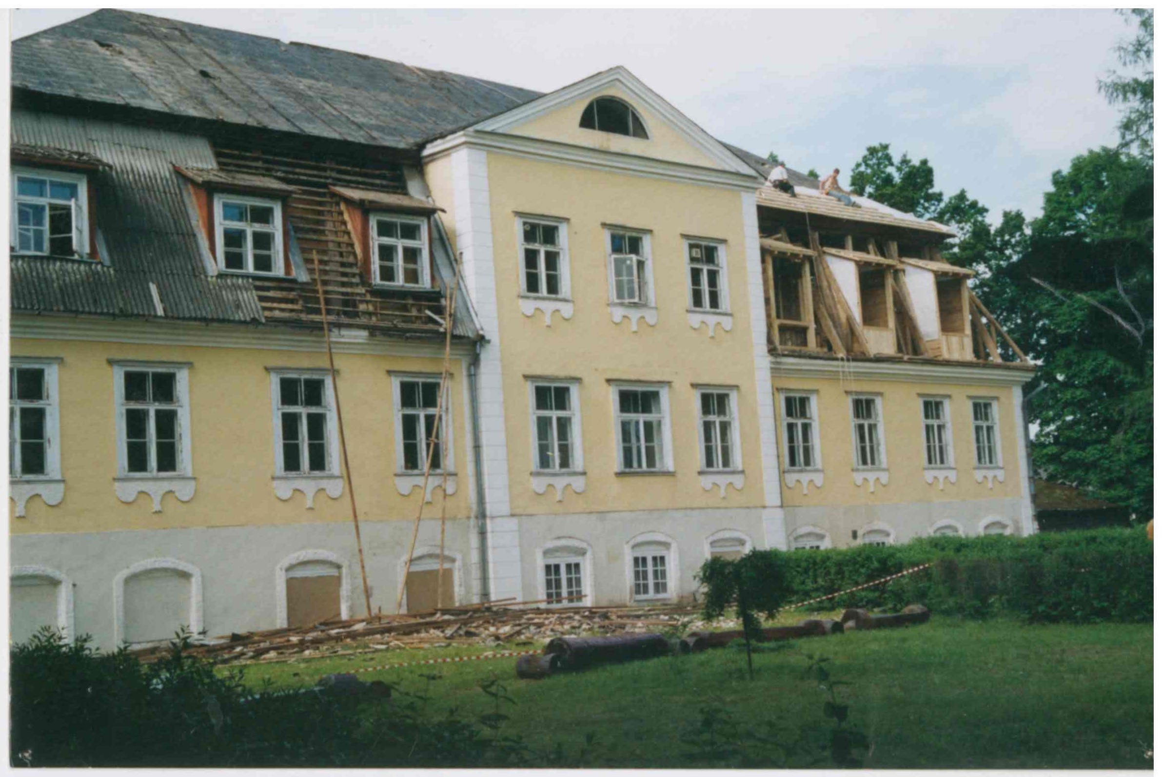 Jumta seguma maiņa un bēniņu (ziemeļu pusē) pārbūve Beļavas muižas kungu mājā. Skats uz ēku no lauces puses.