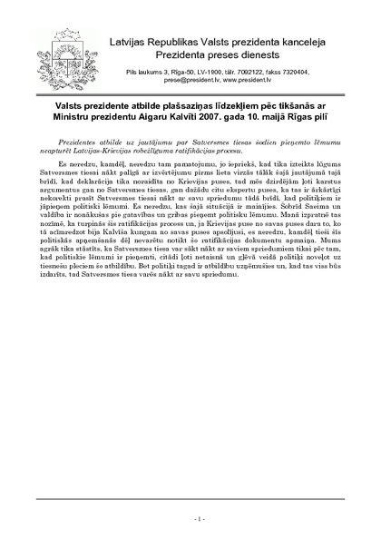 Valsts prezidente atbilde plašsaziņas līdzekļiem pēc tikšanās ar Ministru prezidentu Aigaru Kalvīti 2007. gada 10. maijā Rīgas pilī