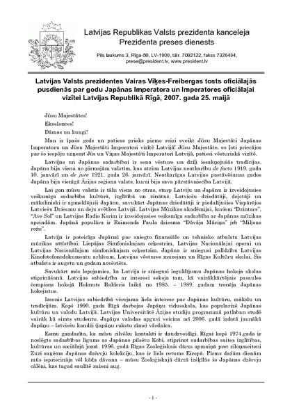 Latvijas Valsts prezidentes Vairas Vīķes-Freibergas tosts oficiālajās pusdienās par godu Japānas Imperatora un Imperatores oficiālajai vizītei Latvijas Republikā Rīgā, 2007. gada 25. maijā