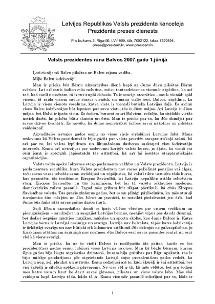 Valsts prezidentes runa Balvos 2007.gada 1.jūnijā