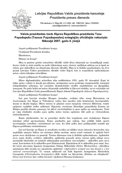 Valsts prezidentes tosts Kipras Republikas prezidenta Tasa Papadopula (Tassos Papadopoulos) sniegtajās oficiālajās vakariņās Nikosijā 2007. gada 4. jūnijā