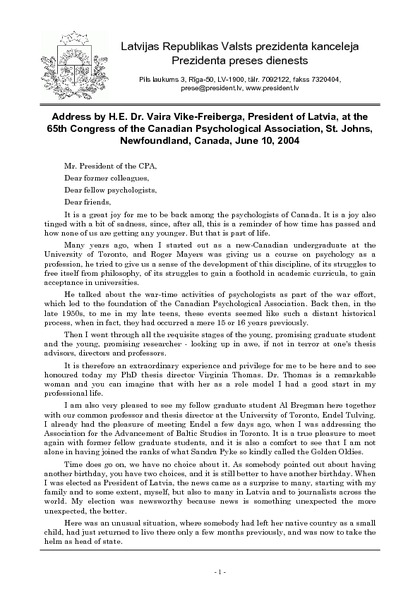 Address by H.E. Dr. Vaira Vike-Freiberga, President of Latvia, at the 65th Congress of the Canadian Psychological Association, St. Johns, Newfoundland, Canada, June 10, 2004