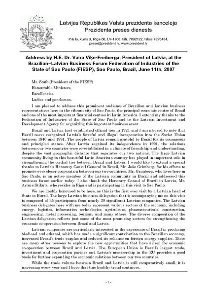 Address by H.E. Dr. Vaira Vīķe-Freiberga, President of Latvia, at the Brazilian–Latvian Business Forum Federation of Industries of the State of Sao Paulo (FIESP), Sao Paulo, Brazil, June 11th, 2007