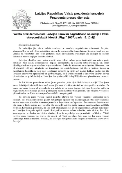 Valsts prezidentes runa Latvijas karavīru sagaidīšanā no misijas Irākā starptautiskajā lidostā „Rīga” 2007. gada 19. jūnijā