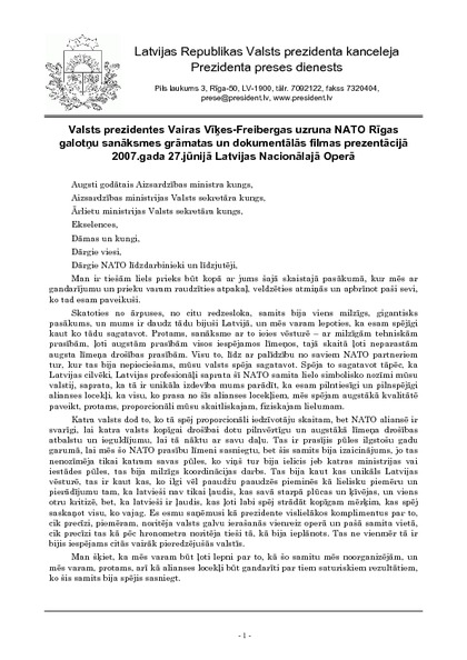 Valsts prezidentes Vairas Vīķes-Freibergas uzruna NATO Rīgas galotņu sanāksmes grāmatas un dokumentālās filmas prezentācijā 2007.gada 27.jūnijā Latvijas Nacionālajā Operā