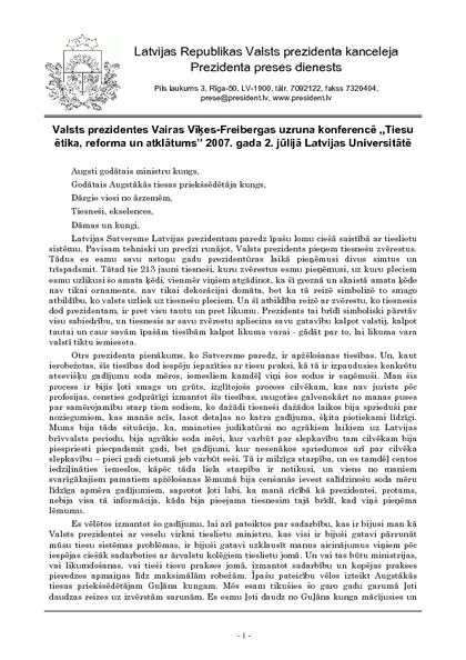 Valsts prezidentes Vairas Vīķes-Freibergas uzruna konferencē „Tiesu ētika, reforma un atklātums” 2007. gada 2. jūlijā Latvijas Universitātē