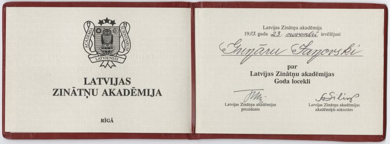 Latvijas Zinātņu akadēmijas Goda locekļa diploms