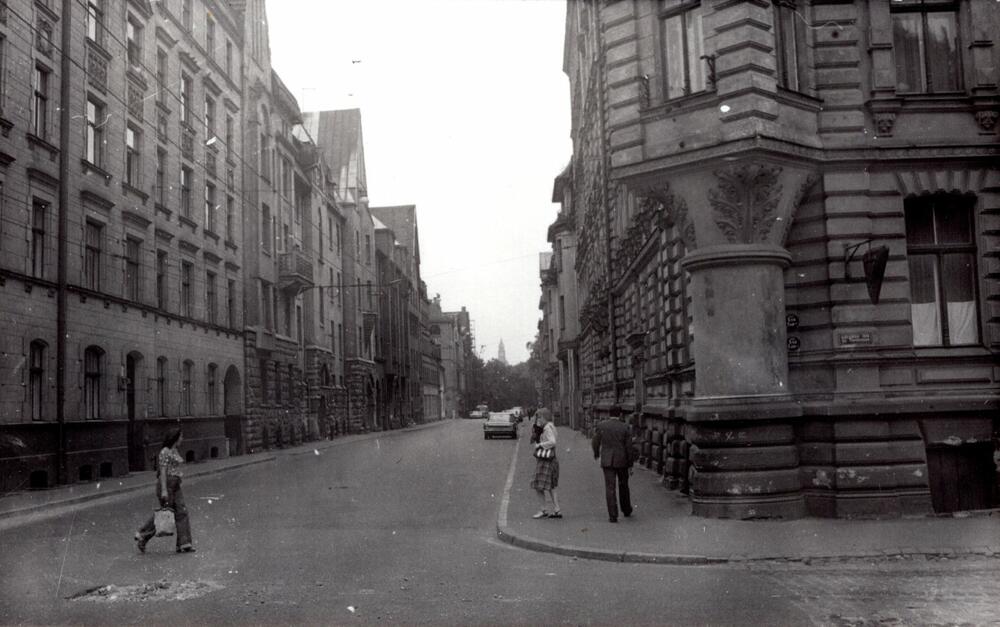 Andreja Upīša iela (tagad Skolas iela) krustojumā ar Lāčplēša ielu. Priekšplānā no labās: 1. īres nams Andreja Upīša ielā 13 (celts 1901. gadā, arhitekts Edmunds fon Trompovskis, tagad Skolas iela 13). No kreisās: 1. daudzdzīvokļu īres nams Andreja Upīša ielā 14, 2. daudzdzīvokļu īres nams Andreja Upīša ielā 12a (celts 1907. gadā), kurā 20. gs. 50.-70. gados darbojās Rīgas centrālais paukošanas klubs.