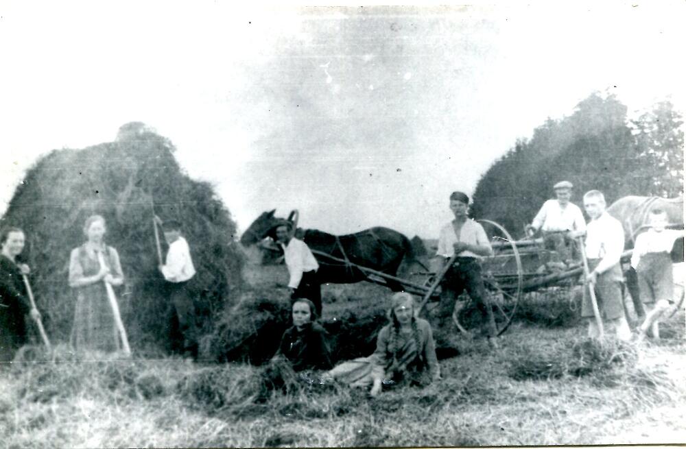 Āboliņa novākšana saimniecībā "Jaunlejas" Valmieras apriņķī. Fonā redzams zirggrābeklis.