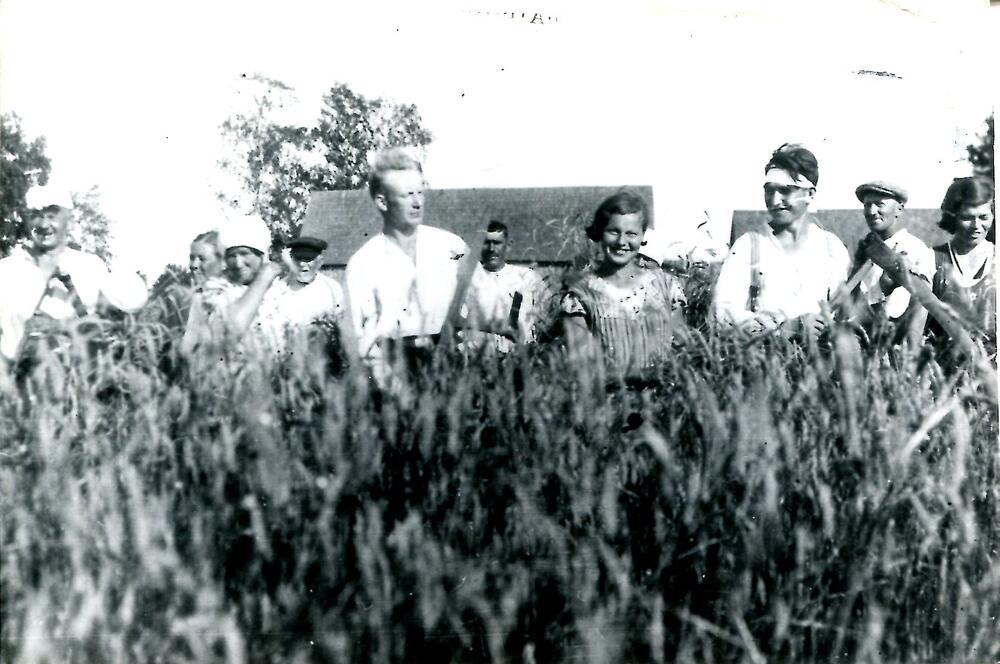 Cilvēki novāc rudzus zemnieku saimniecības laukā Sakas pagastā.