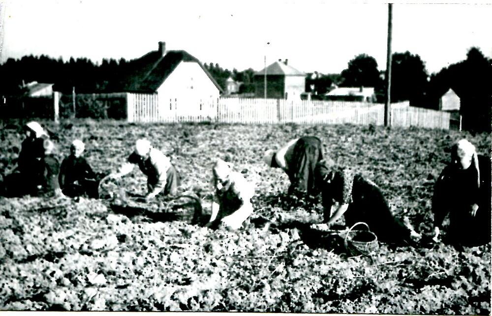 Zemnieces vāc kartupeļus, ko ievieto pītajos grozos.