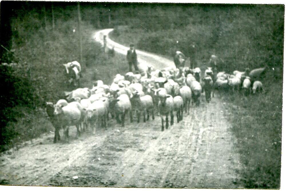 Gani dzen aitu ganāmpulku pa meža ceļu.