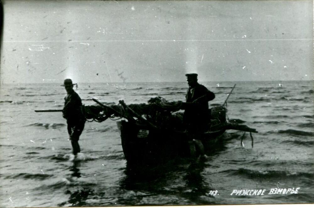 Zvejnieki velk laivu Rīgas jūras līča krastā.