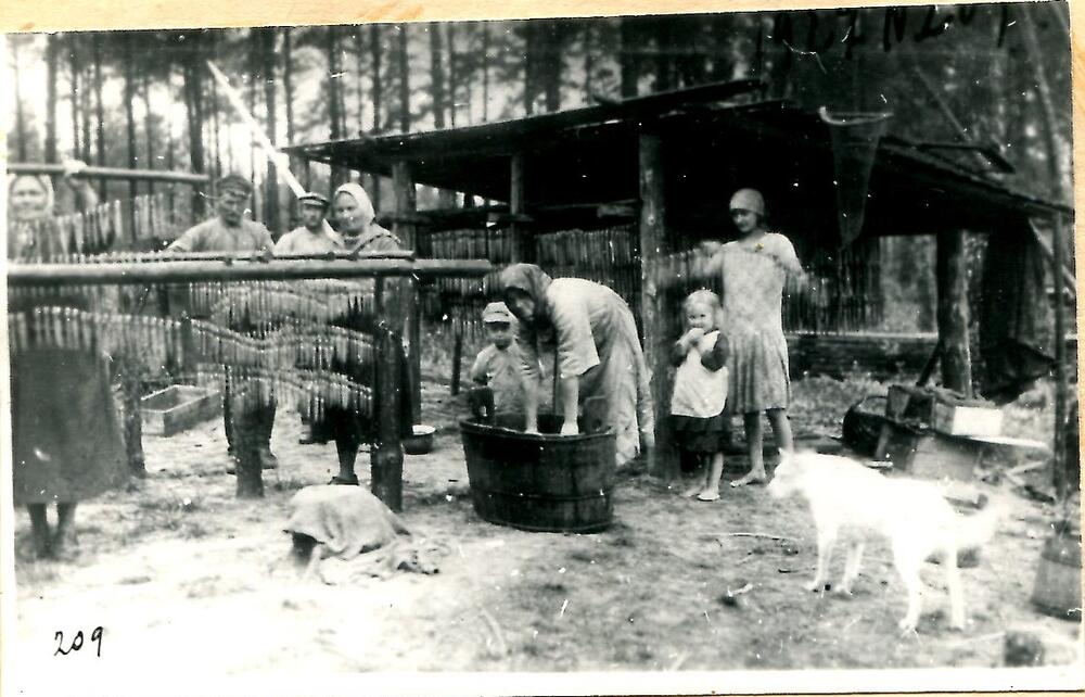 Zvejnieks un tā ģimenes locekļi liek žāvēties reņģes.