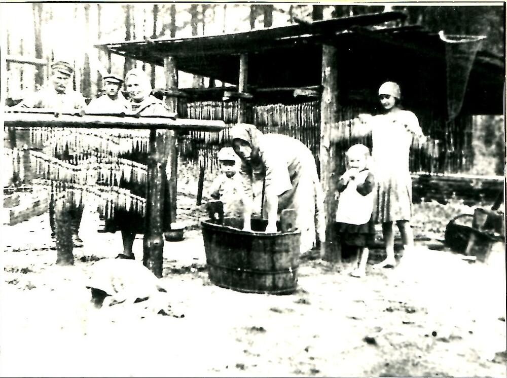 Strādnieces žāvē reņģes Rīgas jūras līča Kurzemes piekrastes zvejnieku ciemā.