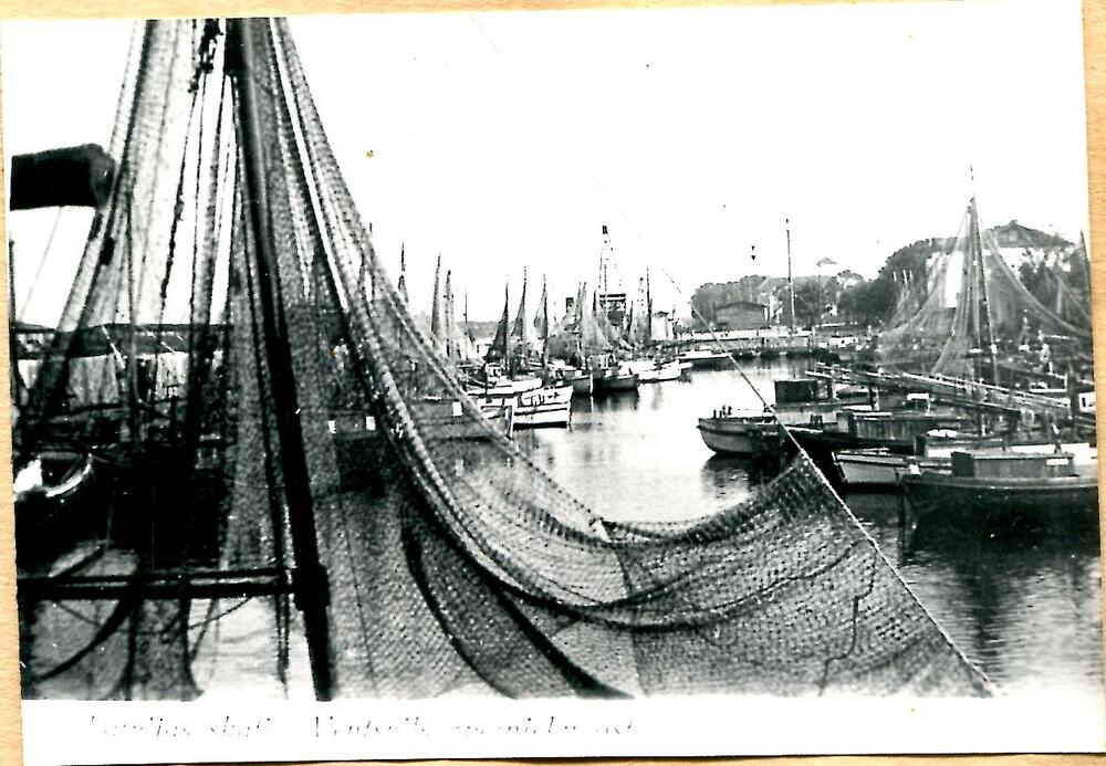 Viens no Ventspils zvejnieku ostas iecirkņiem ar laivām un zvejas tīkliem.