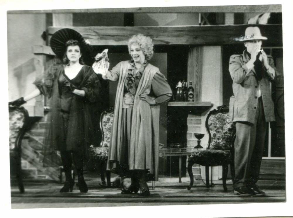 Skats no Maikla Freina lugas "Lampu drudzis" uzveduma Latvijas PSR Andreja Upīša Akadēmiskajā drāmas teātrī (tagad Latvijas Nacionālais teātris). No kreisās: 1. Gunta Virkava Belindas Blēras lomā, 2. Elza Radziņa Dotijas Otlijas lomā, 3. Uldis Norenbergs Frederika Fellouza lomā.