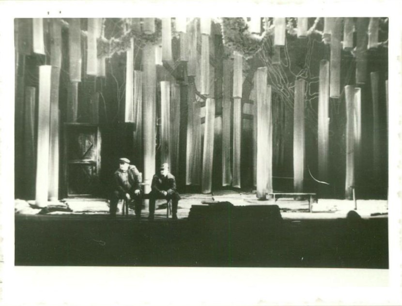 Skats no Paula Putniņa lugas "Ū-uū!" uzveduma Latvijas PSR Andreja Upīša Akadēmiskajā drāmas teātrī (tagad Latvijas Nacionālais teātris). Scenogrāfa Gunāra Zemgala dekorācijas.
