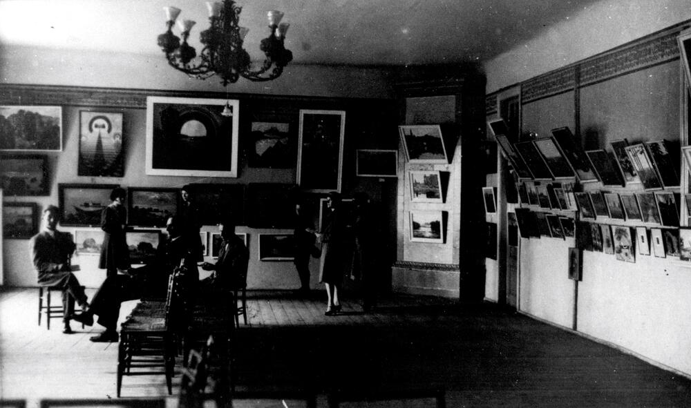 Pirmā mākslas (gleznu) izstāde Smiltenē. Ieskats izstāžu zālē. Izstādē pārstāvēti Jumiķa, Jūlija Krastiņa, Ķikuta, Mazjāņa, Papuļa un Zegnera darbi.