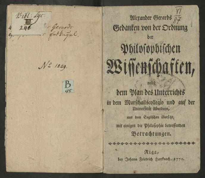 Alexander Gerards Gedanken von der Ordnung der Philosophischen Wissenschaften, nebst dem Plan des Unterrichts in dem Marschallscollegio und auf der Universität Aberdeen, aus dem Englischen übersetzt, mit einigen die Philosophie betreffenden Betrachtungen ...