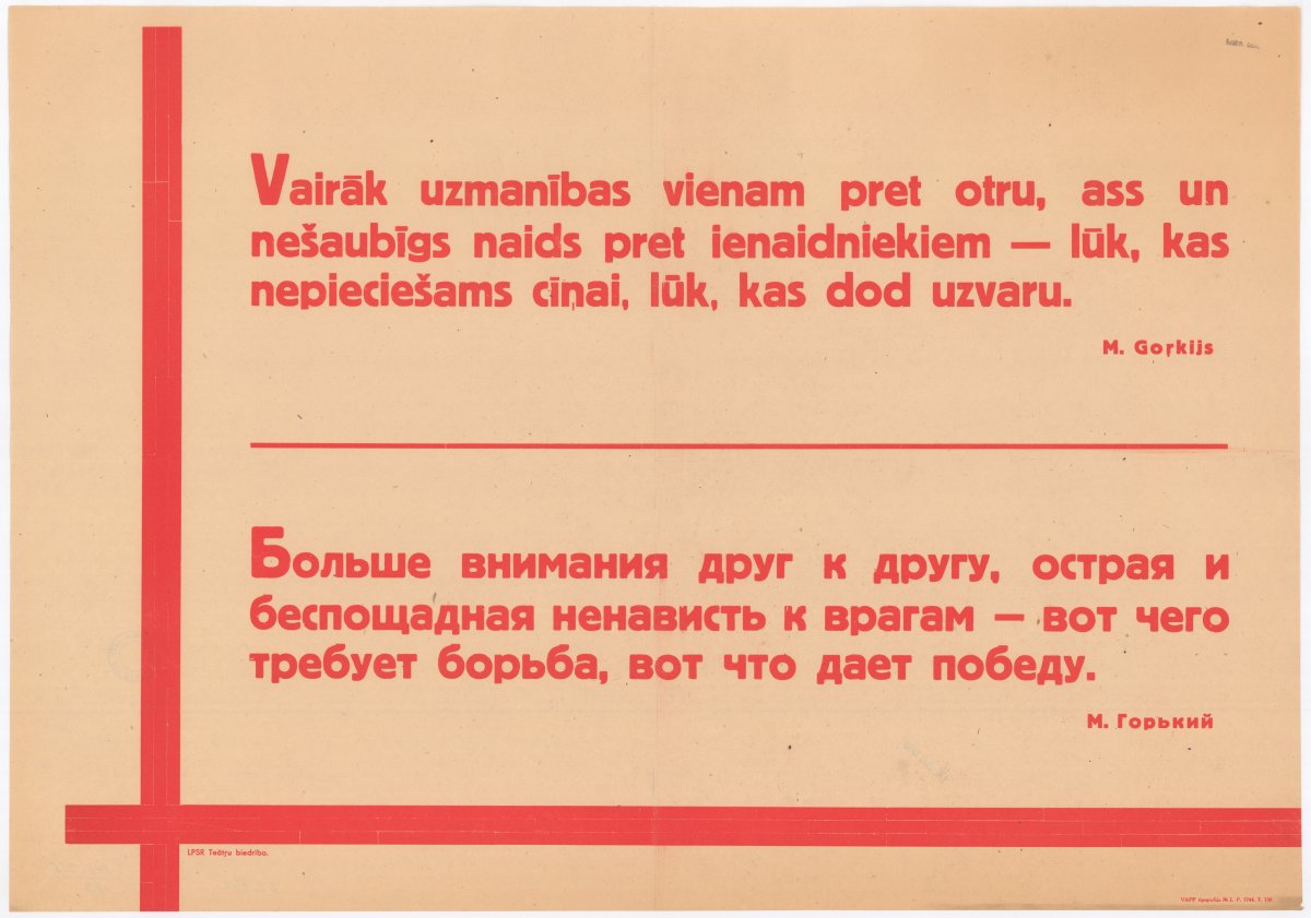 Vairāk uzmanības vienam pret otru, ass un nešaubīgs naids pret ienaidniekiem - lūk, kas nepieciešams cīņai, lūk, kas dod uzvaru. M. Gorkijs [attēls] = Больше внимания друг к другу, острая и беспощадная ненависть к врагам - вот что дает победу. М. Горький
