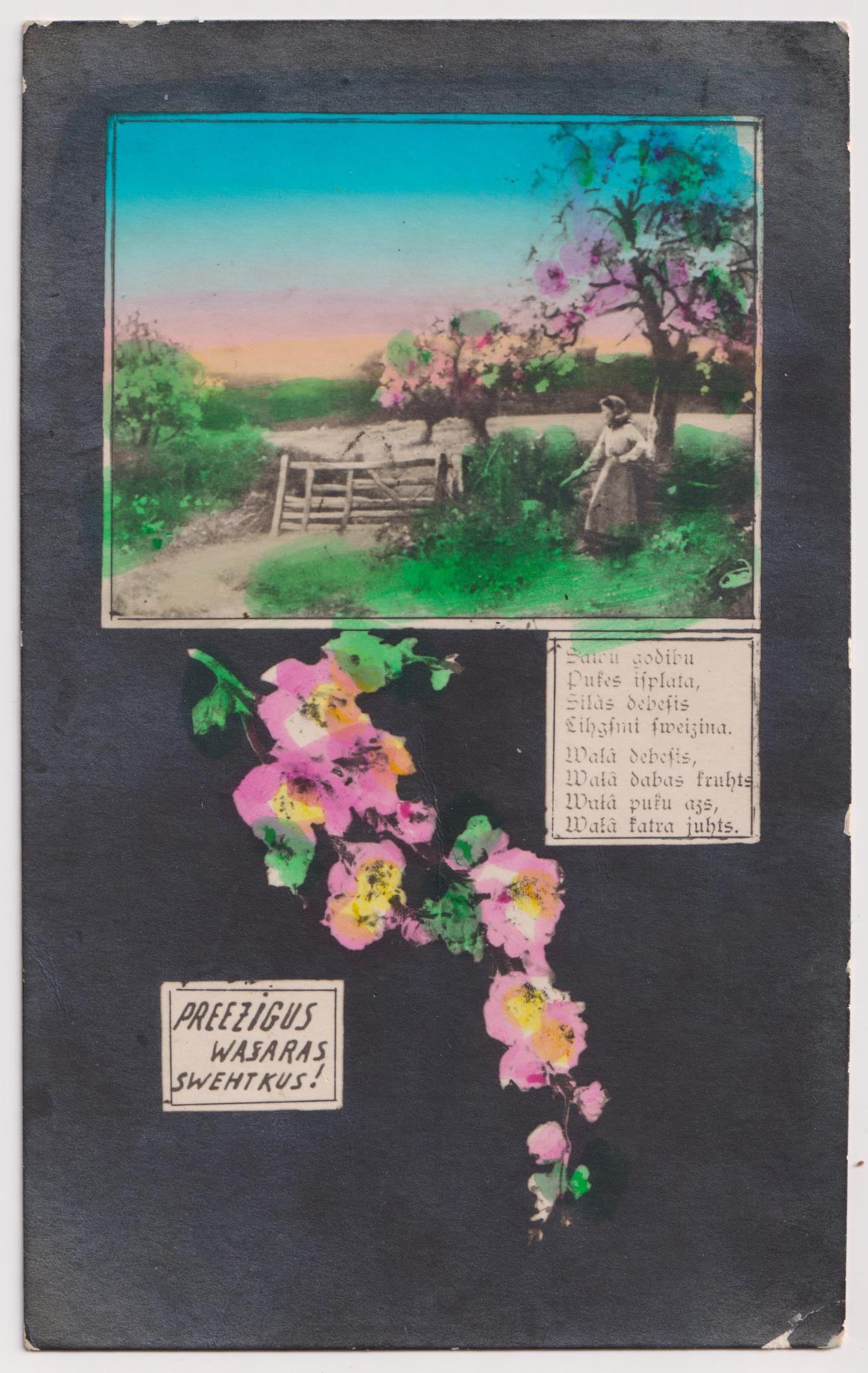 Vasaras svētku atklātne ar sievieti dārzā. Atklātnes priekšpusē publicēts dzejolis vecajā drukā. Otrā pusē apsveikuma teksts rokrakstā.