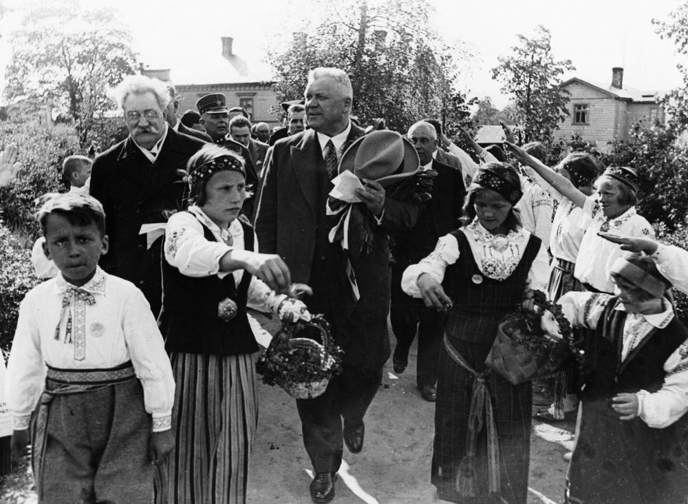 Bērni sagaida Latvijas valdības pārstāvjus kā Goda viesus Bērnu svētkos Jaunekļu kristīgās savienības (YMCA) sporta laukumā Ķieģeļu ielā 1a (tagad Emiļa Melngaiļa iela). 2. rindā no kreisās puses: 1. izglītības ministrs Augusts Tentelis, 2. Latvijas Valsts un Ministru prezidents Kārlis Ulmanis.