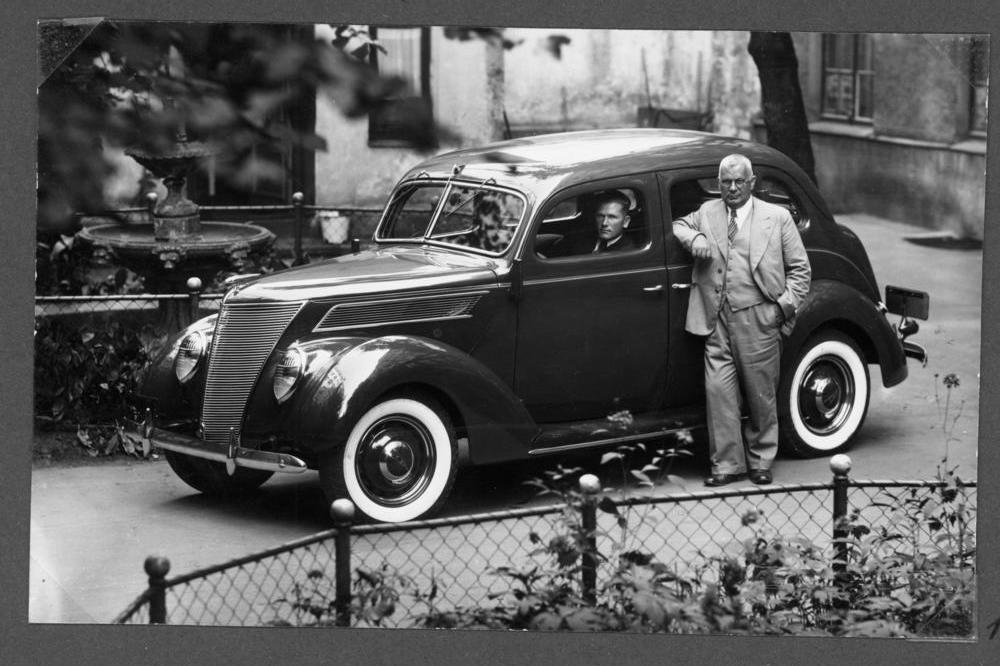 Rīgas apriņķa tautskolu inspektors un skolu valdes priekšsēdētājs Roberts Dālmanis pie sava vieglā automobiļa "FORD - V8 Standard".