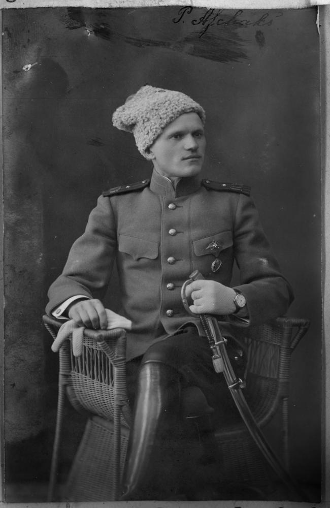 Krievijas impērijas armijas Latviešu strēlnieku rezerves bataljona praporščiks Pēteris Ašaks Josifa (Jāzepa) dēls (dzimis Kurzemē, Gārsenes pagastā, Ilūkstes apriņķī). Pabeidzis 1. Pēterhofas (tagad Sanktpēterburga) praporščiku skolu, piekomandēts 4. sibīrijas strēlnieku brigādē, no kurienes pārcelts uz Latviešu strēlnieku rezerves bataljonu. Portrets.