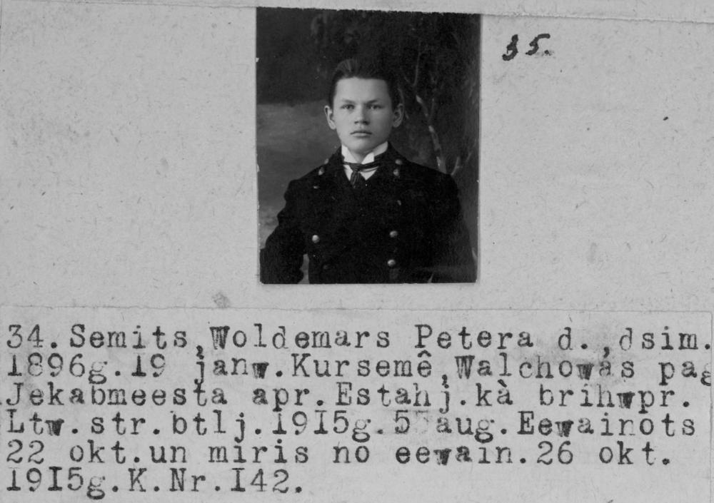 Krievijas impērijas armijas 3. Kurzemes latviešu strēlnieku bataljona strēlnieks Voldemārs Zemītis Pētera dēls (dzimis 1896. gada 19. janvārī, Kurzemē, Valčovas (?) pagastā, Jēkabmiesta (tagad Jēkabpils) apriņķī). 1915. gada 5. augustā iestājās kā brīvprātīgais Latviešu strēlnieku bataljonā, ievainots tā paša gada 22. oktobrī kaujās pie Slokas un miris 26. oktobrī, apglabāts Rīgas Brāļu kapos. Portrets.