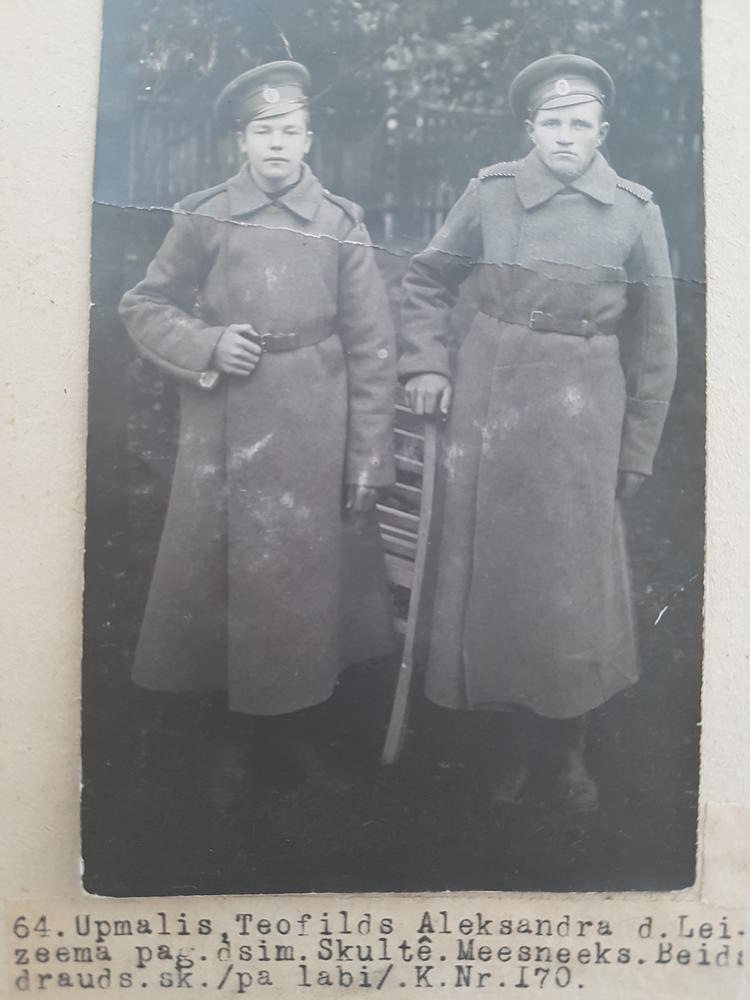 Krievijas impērijas armijas latviešu strēlnieki: no labās puses: 1. Teofilds Upmalis Aleksandra dēls (dzimis Leizēmas (?) pagastā, Skultē) Amats - miesnieks. Beidzis draudzes skolu. 2. strēlnieka vārds nav zināms. Dubultportrets.