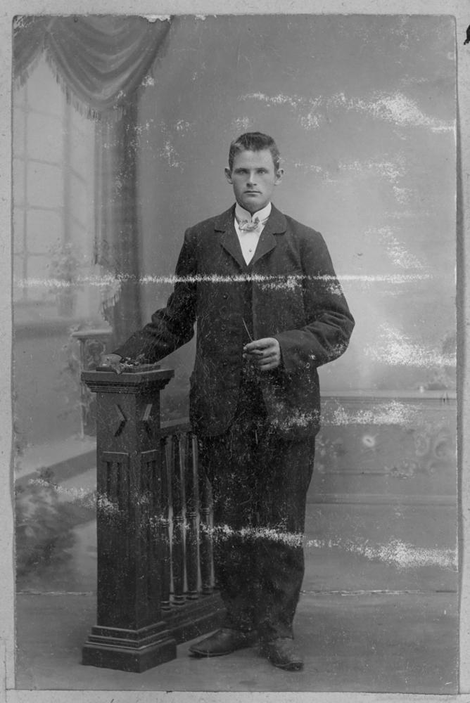 Krievijas impērijas armijas latviešu strēlnieks Pēteris Grusniņš Borisa dēls (dzimis Holmogoras pagastā (?), Jaunjelgavas apriņķī) kritis kaujā pie Slokas 1915. gada 22. oktobrī 26 gadu vecumā. Apglabāts Slokas pareizticīgo kapos. Portrets studijā.