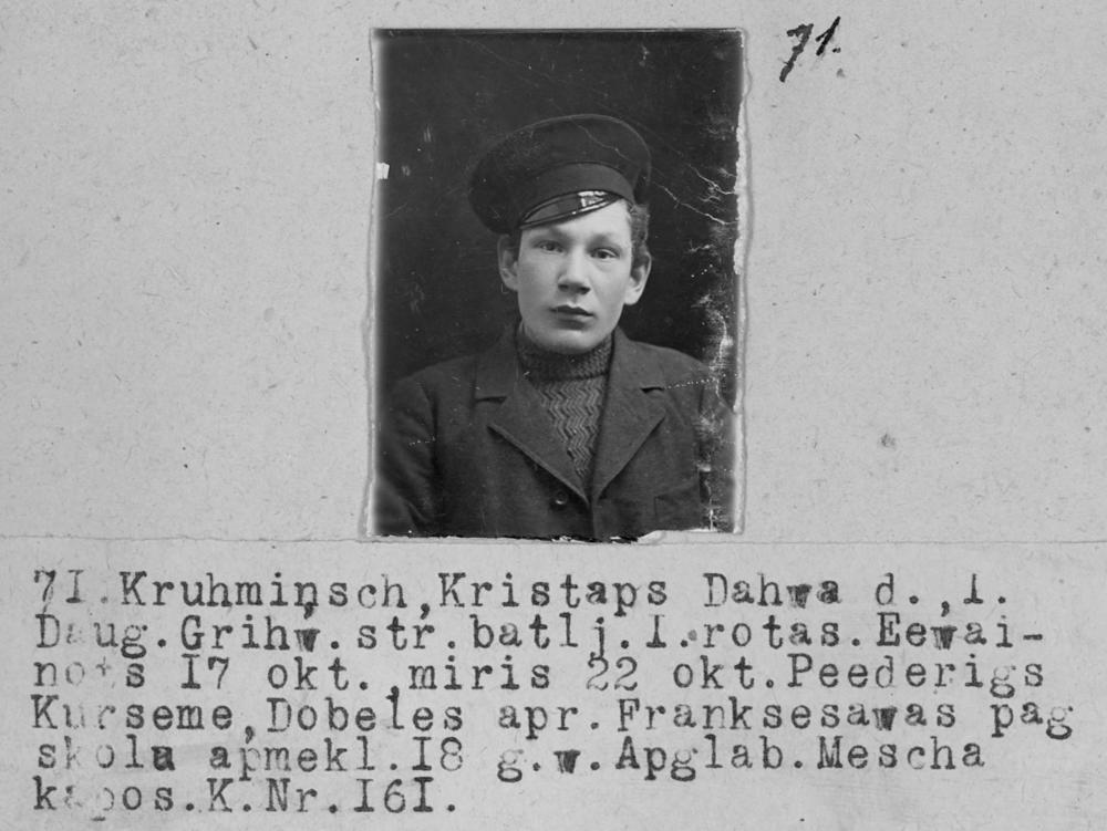 Krievijas impērijas armijas 1. Daugavgrīvas latviešu strēlnieku bataljona 1. rotas strēlnieks Kristaps Krūmiņš Dāvja dēls (dzimis Kurzemē, Dobeles apriņķī, Franksesavas pagastā (tagad Jaunsvirlaukas pagasts)) Skolu apmeklējis Pirmā pasaules kara kaujās 18 gadu vecumā 1915. gada 17. oktobrī ievainots, miris 22. oktobrī un apglabāts Meža kapos. Portrets.