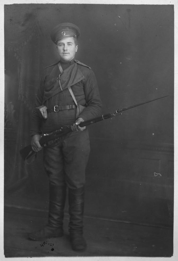 Krievijas impērijas armijas 3. Kurzemes latviešu strēlnieku bataljona strēlnieks Ansis Bērziņš. Kritis Pirmā pasaules kara kaujā 1915. gada 24. novembrī, apglabāts Pleskodāles kapos. Portrets.