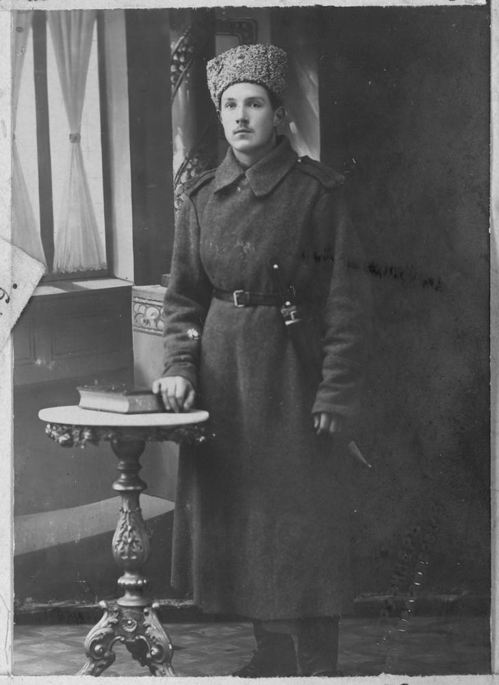 Krievijas impērijas armijas 2. Rīgas latviešu strēlnieku bataljona izlūks - kavalērists Fricis Ozoliņš Friča dēls (dzimis Tukuma apriņķī, Bikstu pagastā) Ticība - luterānis, nodarbošanās - zemkopis. Kritis 18 gadu vecumā Pirmā pasaules kara kaujās pie Ķekavas 1916. gada 8. martā un apbedīts Rīgas Brāļu kapos. Portrets studijā.