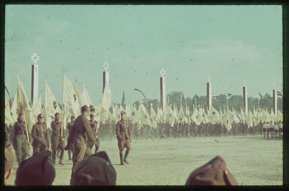 Latvijas Aizsargu organizācijas 20 gadu pastāvēšanas svinību ietvaros notiekošo aizsargu vingrošanas un sporta svētku atklāšana Uzvaras laukumā. Parādes gājienā aizsargu sporta pulciņu karognesēji.